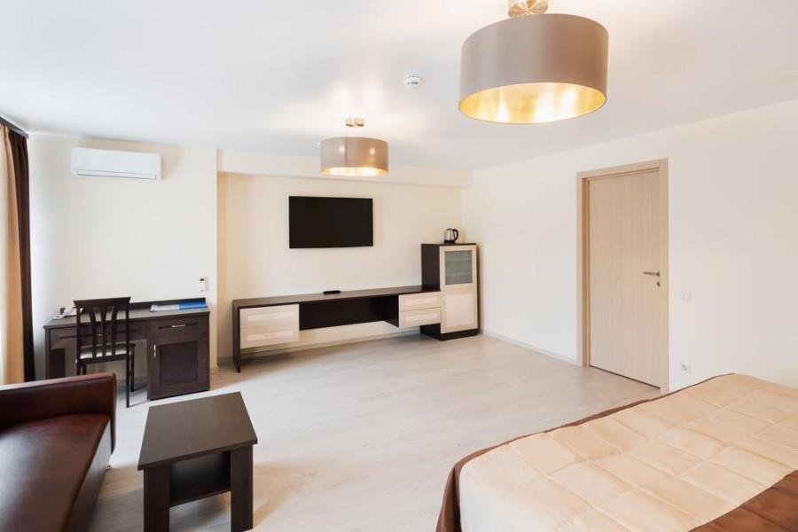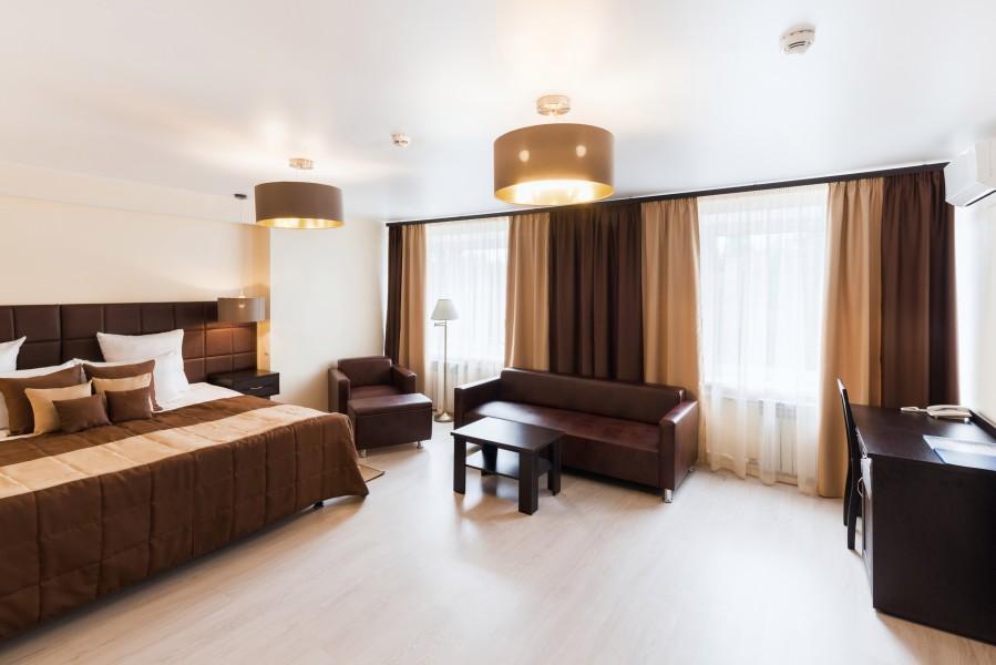 Номер «люкс» - самый большой и лучший номер в гостинице с гостевой зоной и кроватью размера king-size. Проживая в этом номере, Вам не нужно будет беспокоиться о банном халате, тапочках – все это включено в стоимость проживания. Стоимость от 8400